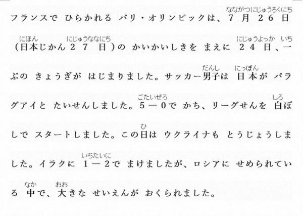 将在法国举行的巴黎奥运会在26日(日本时间27日)举行开幕式之前,于24日开始了部分比赛项目。在男子足球比赛中,日本队对阵巴拉圭队。日本队以5比0获胜,以一场胜利开始小组赛。乌克兰今天也出席了会议。他们1比2输给了伊拉克,但是球员们大声欢呼,因为他们的国家遭到了俄罗斯的攻击。